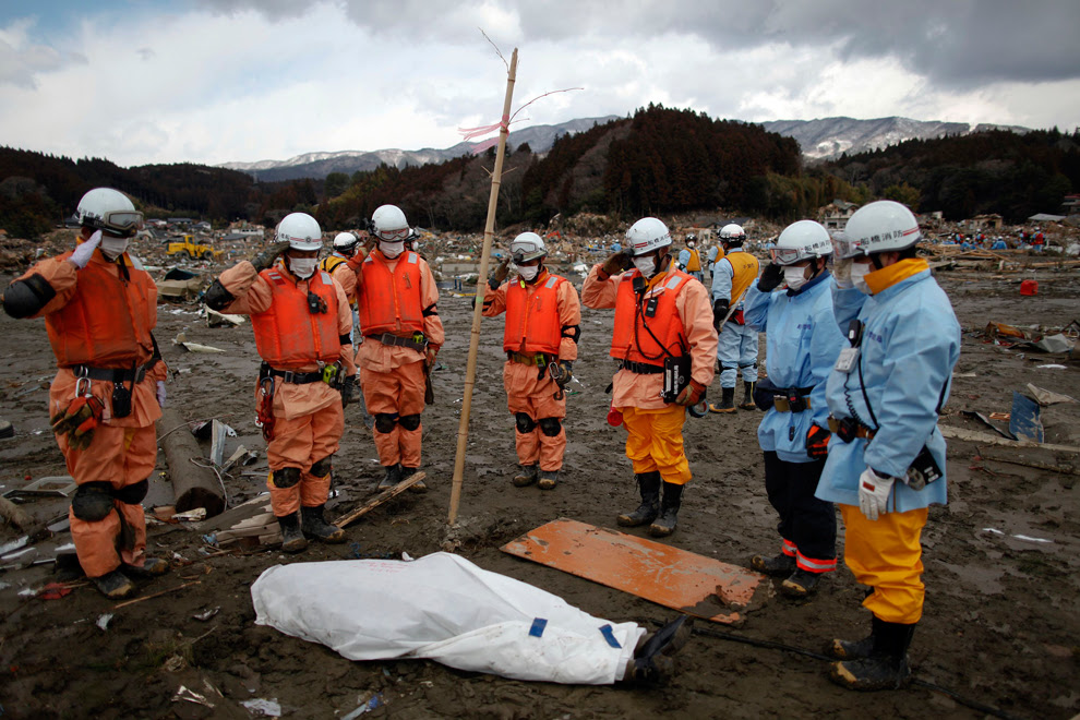 Rescue workers salute next to a body they retrieved from the rubble in Rikuzentakat March 17. (Damir Sagolj/Reuters) #21