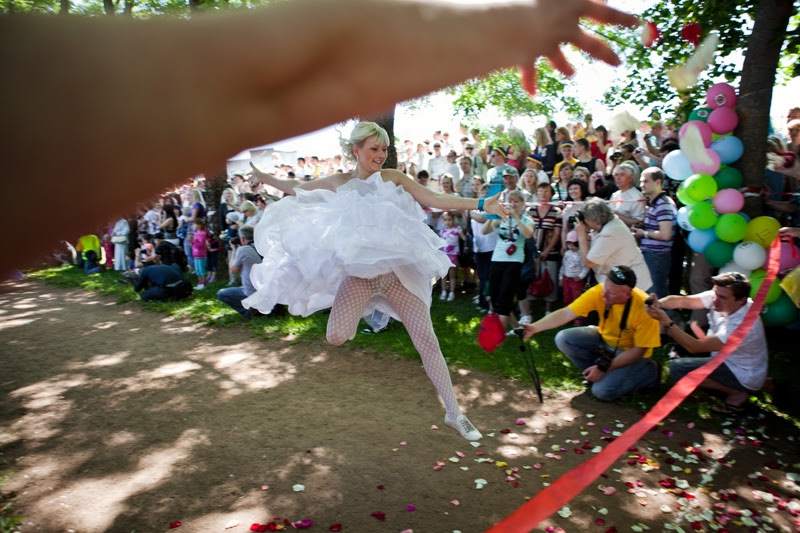 66 participants of the runaway brides’ parade walked in a column in Narva. Near the castle walls there were presentations of marriageable girls, balls launching and a warm up before a sprint. Then the dash itself and winners’ awarding. After all brides threw their bouquets, and of course they were photographed.
